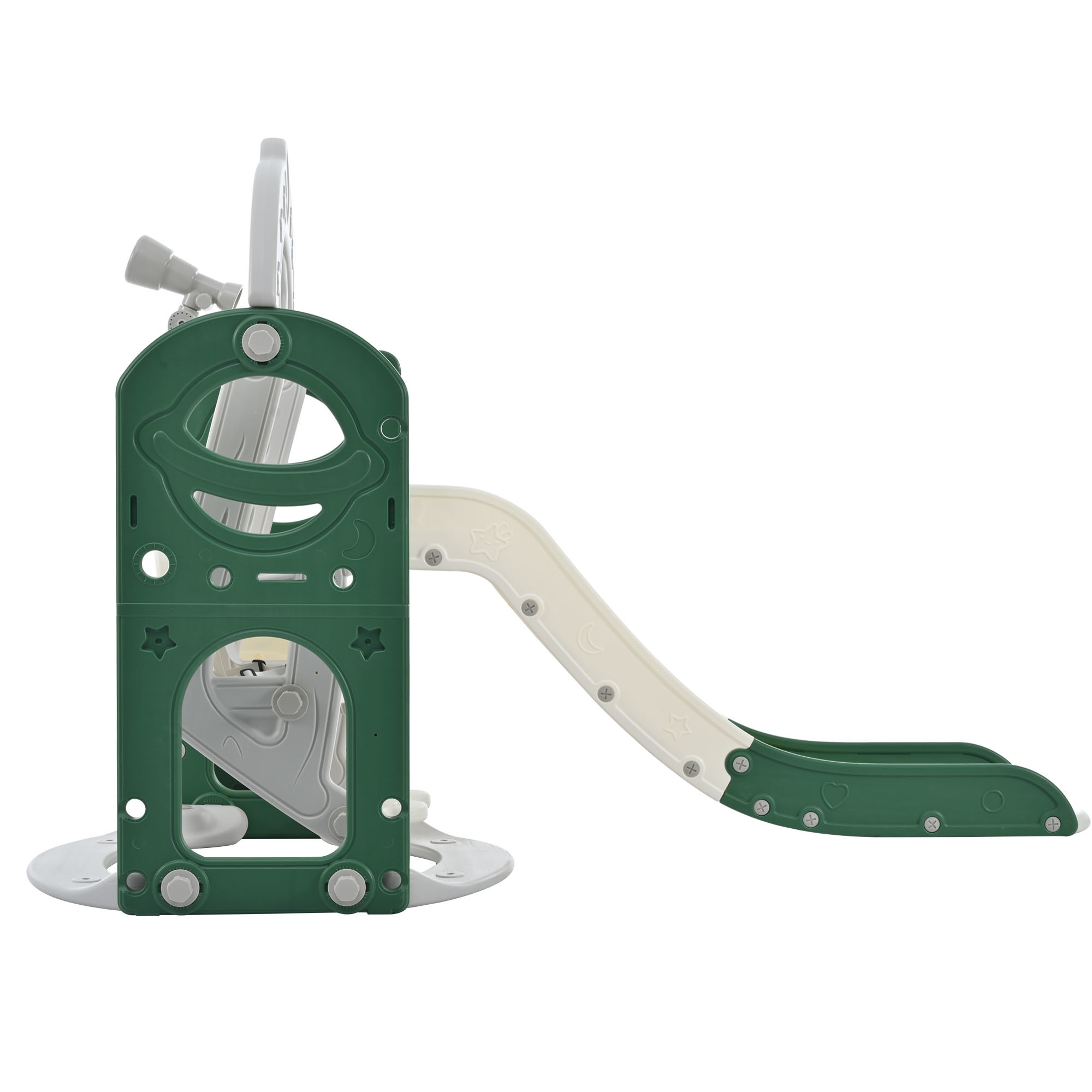 [Children's Playground 5-in1] Refreshing styling design! Delicate and cute freestanding swing and slide set for toddlers with five functional parts: 1 slide, 1 climbing ramp, 1 swing, 1 telescope, and 2 golf holes. This set allows children to completely release their playful nature, and they can play with their friends for hours!